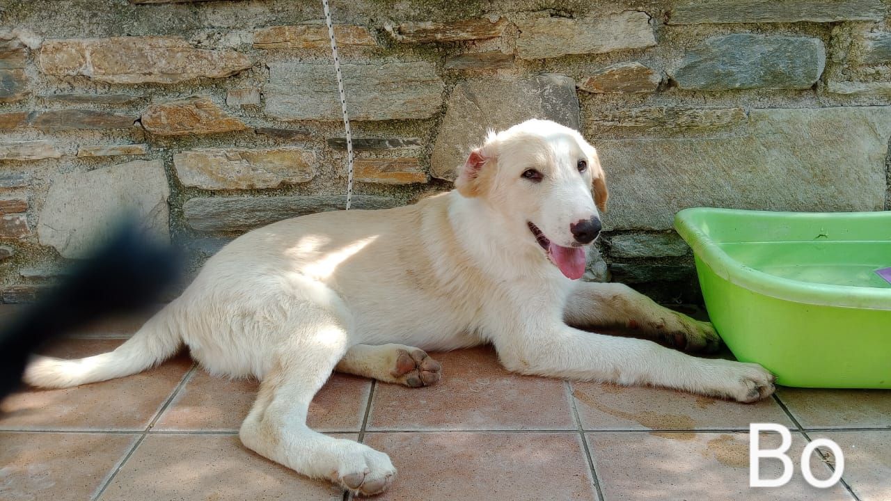 Gemeinsam mit seiner Mutter wurden Bo und seine zwei Brüder im Sommer an Mülltonnen gefunden, auf der Suche nach etwas Essbarem. Alle vier waren stark abgemagert. Ihre Mutter war bereits im Mai von Tierschützern entdeckt und gefüttert worden, doch erst Monate später führte sie ihre Welpen aus ihrem Versteck hervor. Seitdem lebt Bo zusammen mit seiner Familie behütet in einer liebevollen Pflegestelle, wo er zusammen mit anderen Hunden, Katzen und sogar Hühnern aufwächst.