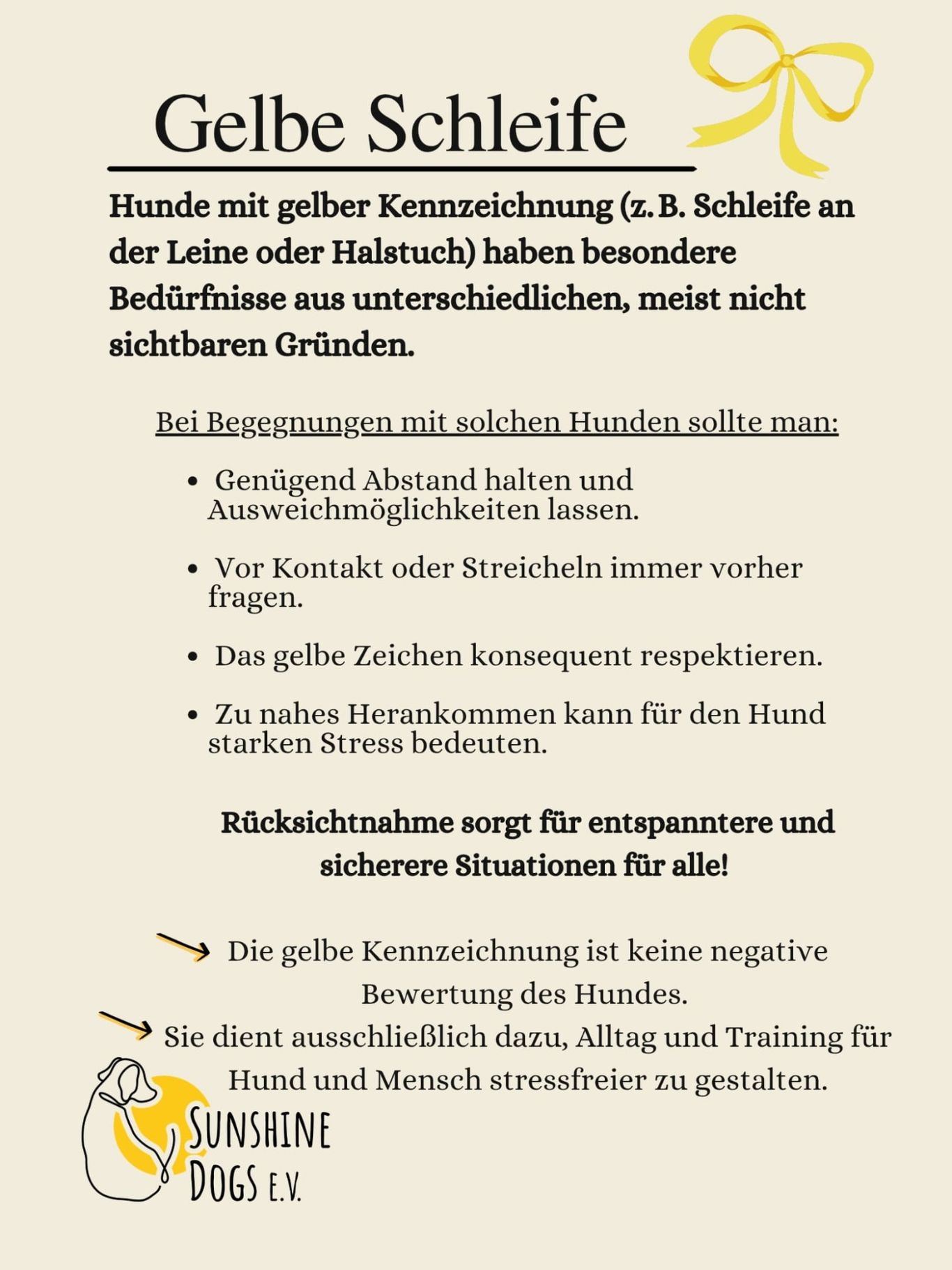 Hunde, die eine gelbe Schleife, ein gelbes Halstuch oder eine gelbe Markierung an Leine oder Geschirr tragen, benötigen aus verschiedenen Gründen mehr Raum, zum Beispiel, weil sie unsicher, im Training, gesundheitlich eingeschränkt oder einfach schnell gestresst sind.