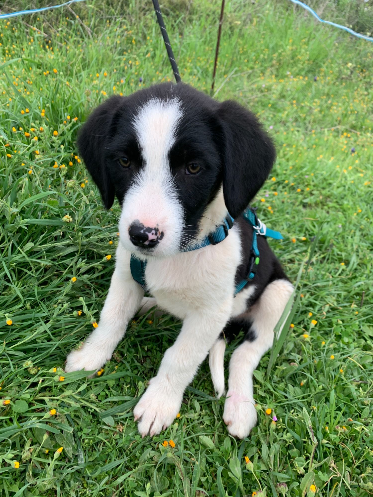 Olive ist ein schwarz-weißer, süßer Welpe mit weichem Fell und braunen Augen.